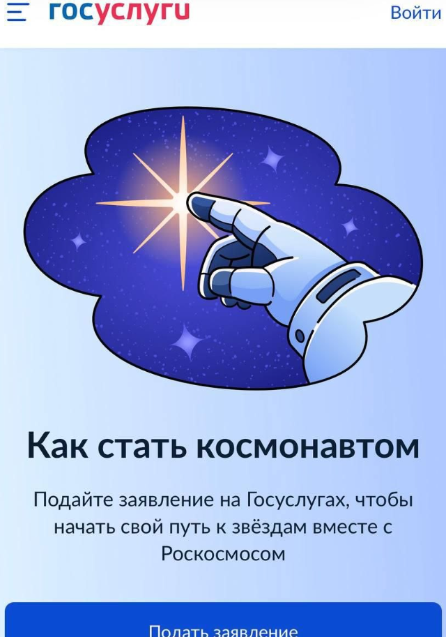 На платформе «Госуслуги» открыли приём заявлений в отряд космонавтов — подать документы можно до 30 июня 2026 года. Участвовать в отборе могут граждане России младше 35 лет. Среди требований: рост от 150 до 190 см, вес от 50 до 90 кг, профильное высшее образование и минимум три года стажа по специальности.