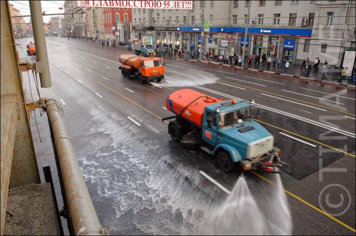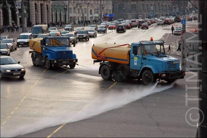 Поливалки катались туда-сюда, омывая дорогу.
