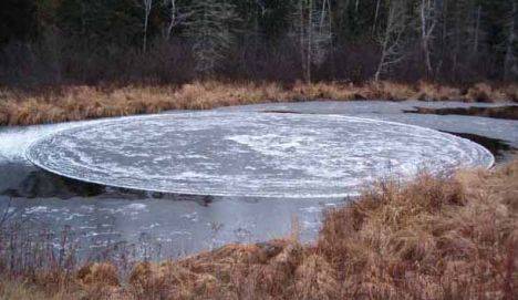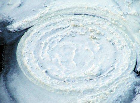 Эти два круга являются фокальными точками для разрушения льда и могут быть вызваны подъемом теплых вод озера. Темный цвет кругов объясняется истончением льда, который обычно остается вплоть до июня. Подъем теплых вод не должен казаться чем-то странным в некоторых сравнительно мелководных районах озер(пример), где была отмечена гидротермальная активность. Например, когда круг образуется в центре озера(см. фото ниже). Такие круги уже наблюдались в 1985 и 1994 году, хотя они были не так ярко выражены. Однако, расположение круга вблизи южной оконечности озера (на фото выше), где вода является относительно глубокой и холодной вызывает недоумение.
