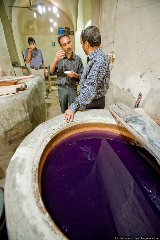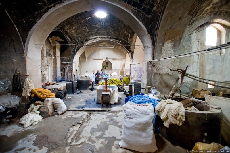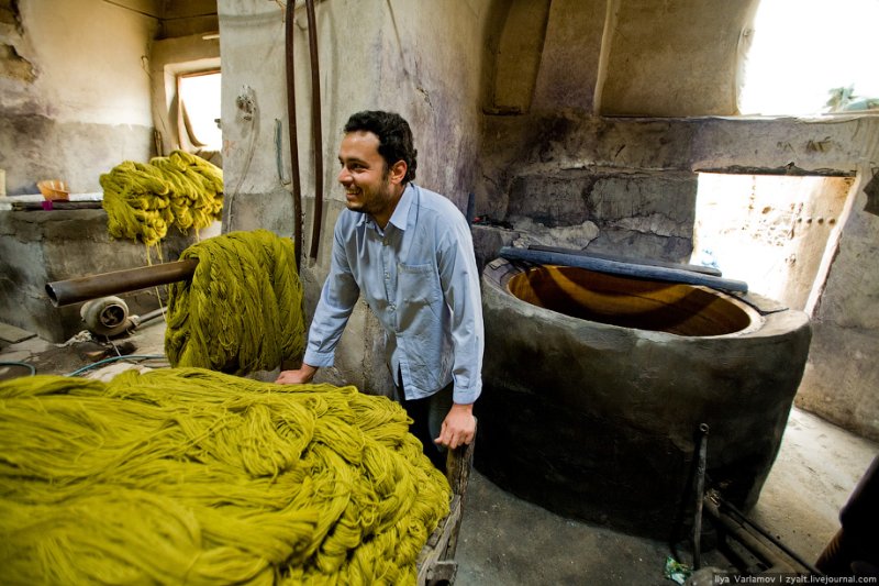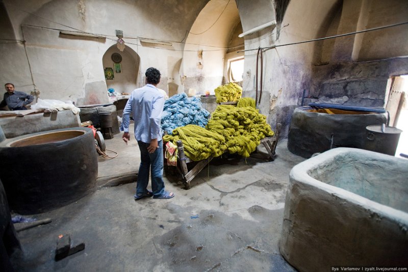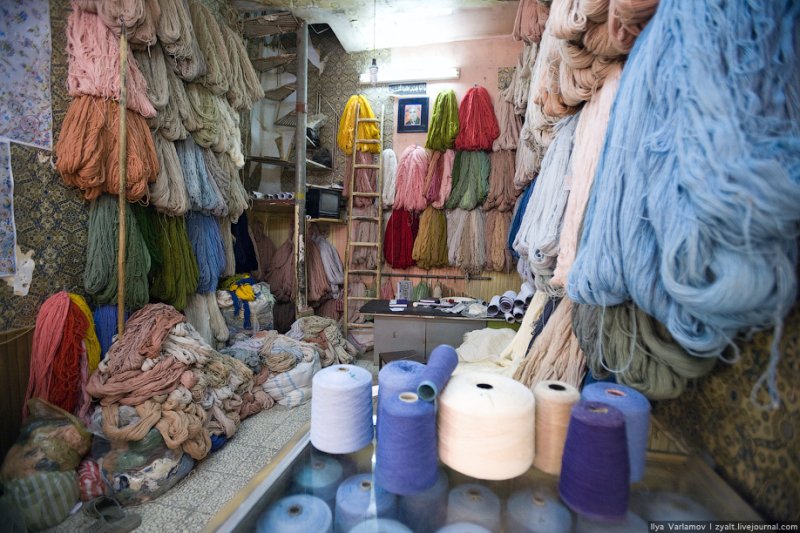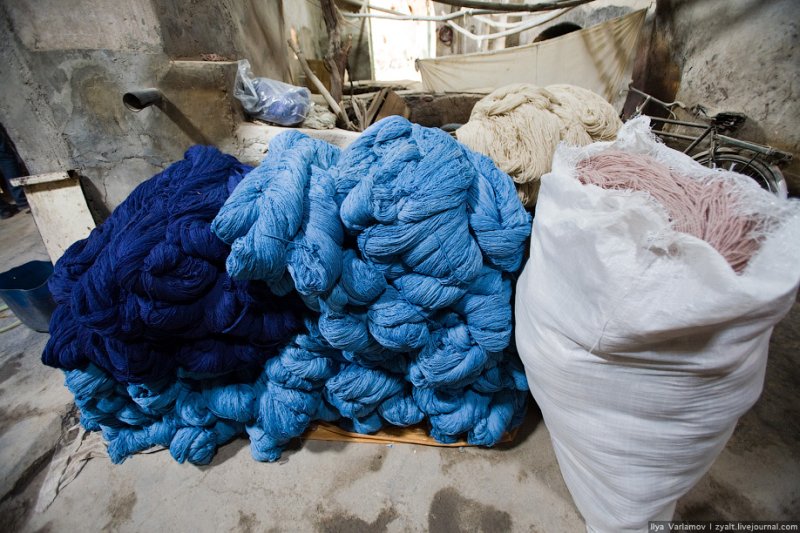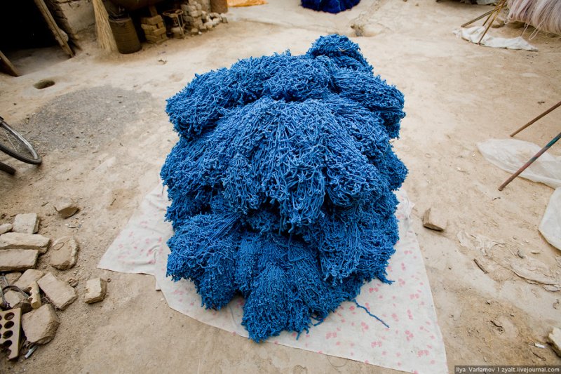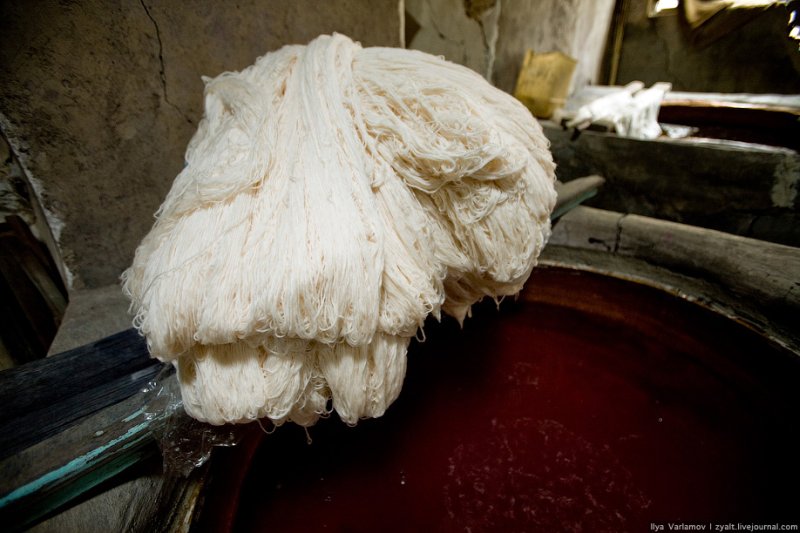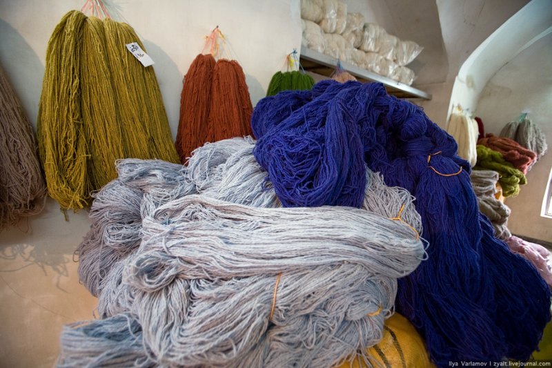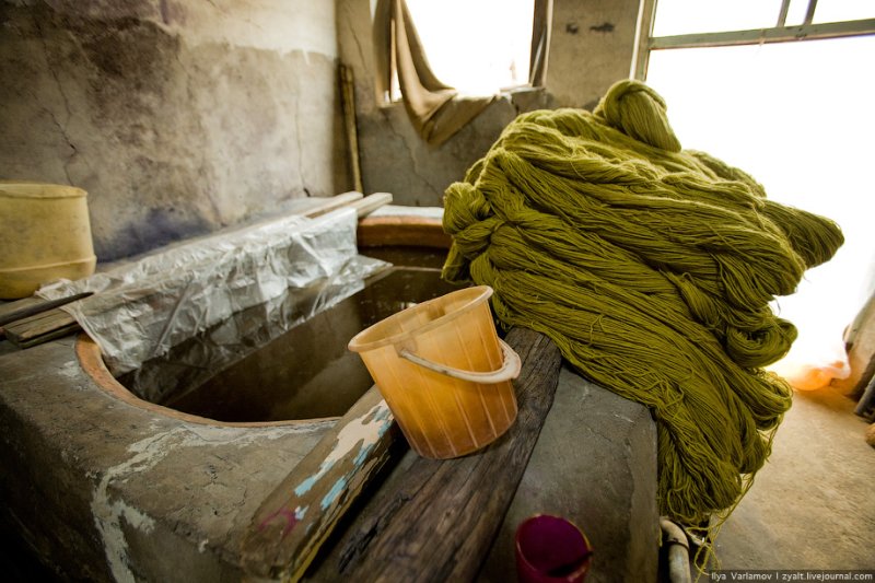 После этой операции шерсть промывают в чистой воде и развешивают для сушки. Красители получают из корней марены, оболочки грецких орехов, листьев винограда, стеблей спаржи, кожуры гранатов, из кошенили, прокисшего молока. Для крашения используются также минеральные и химические вещества в сочетании с каустической содой, лимонной кислотой и др., необходимыми для того чтобы закрепить краску и предотвратить ее от вымывания и стирания. После окраски и сушки, нитки отправляются на рынок, где их продают килограммами ковропрядам, но об этом в следующей серии.