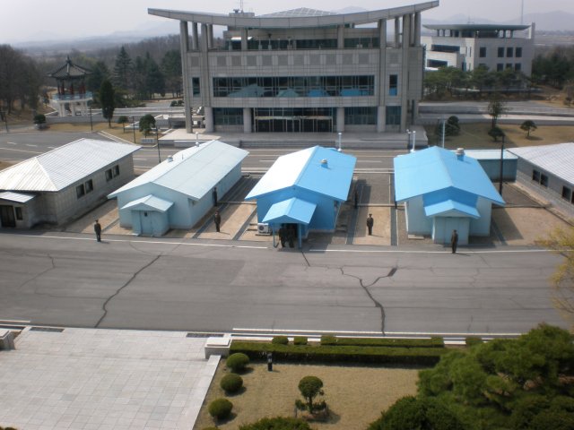 Это тридцать восьмая параллель ? это именно то самое здание, которое отделяет Северную от Южной Кореи. Вот эти бараки, это места проведения конференций и встреч представителей Южной и Северной Кореи, тридцать восьмая параллель.