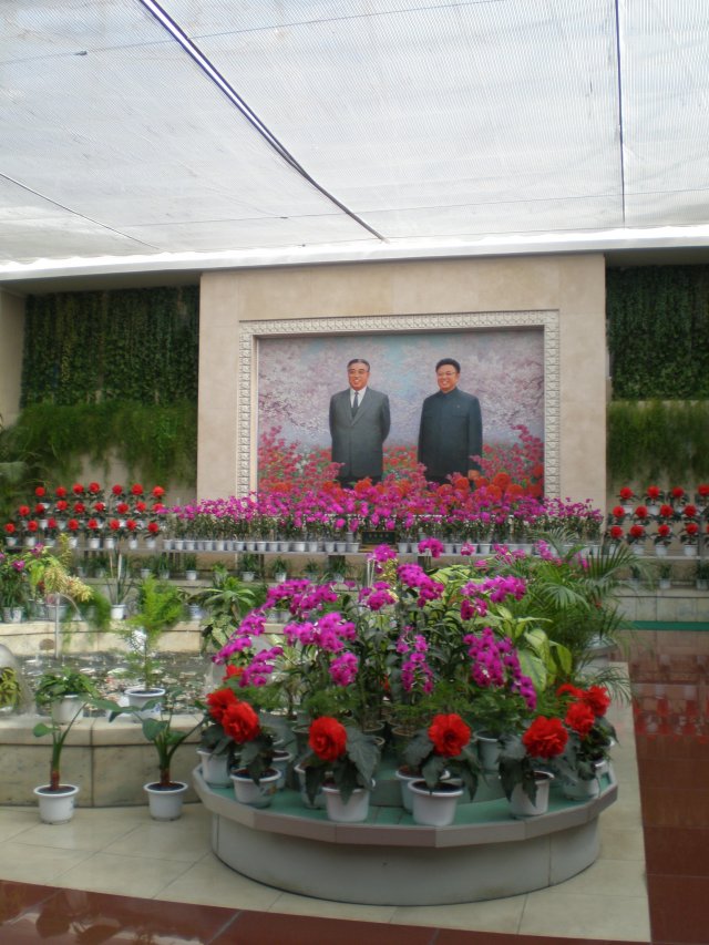 Это выставка цветов, здесь цветы двух видов. Это цветы кимирсенхва и кимченирхва, маленькие цветы ? это кимирсенхва, а большие цветы ? это кимченирхва. История цветов очень интересная, потому что цветы вывели два сторонника чучхе в Индонезии и Японии. Кимирсенхва вывел революционер, живший в Индонезии во времена Сухарто, он вывел этот цветок и подарил товарищу Ким Ир Сену. Но после того как к власти пришел Сухарто, цветок исчез и только вот недавно был найден снова и возвращен как бы в Северную Корею. И сейчас он является символом чучхе и символом товарища Ким Ир Сена. Кимченирхва вывел чучхеист из Японии, японец, который подарил этот цветок товарищу Ким Чен Иру.