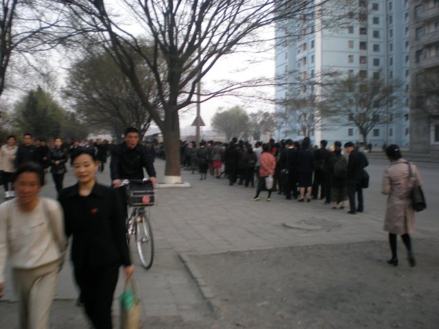 Это очереди на транспорт. Маршруток там нет, троллейбусы делаются вручную, так как нет пресса, поэтому немножко они такие помятые. На мой вопрос, почему такие крыши у троллейбусов, мне объяснили, что, ты понимаешь, в Корее нет пресса, поэтому все делается вручную, так как основой идеологии чучхе является опора на собственные силы.