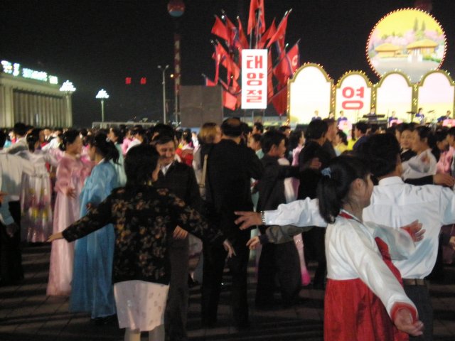 Это ? праздник весны, день рождения товарища Ким Ир Сена, танцы. Представьте себе, что весь город выходит на площади и танцует. Потом идет сигнал, все строятся в шеренги, и уходят в неизвестном направлении. Все очень четко, все очень отработано. Вот тут на фото даже я принимаю участие в этих танцах.