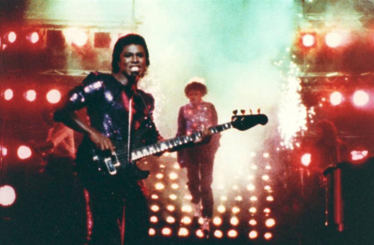 Майкл Джексон (на заднем плане) во время съемок рекламы ?Пепси?, когда у него загорелись волосы, а его брат Джерман (на переднем плане) продолжает выступать, не зная, что происходит. (AP)