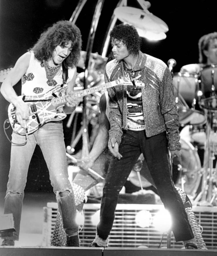 Гитарист Эдди Ван Хален исполняет соло на гитаре во время концерта Майкла Джексона в Ирвинге, штат Техас. Этот бессмертный гитарных риф был записан гитаристом специально для песни Майкла ?Beat It?, чему совсем не обрадовался напарник Ван Халлена, Дэвид Ли Рот, однако все остальные были в восторге от песни. (Carlos Osorio/AP)