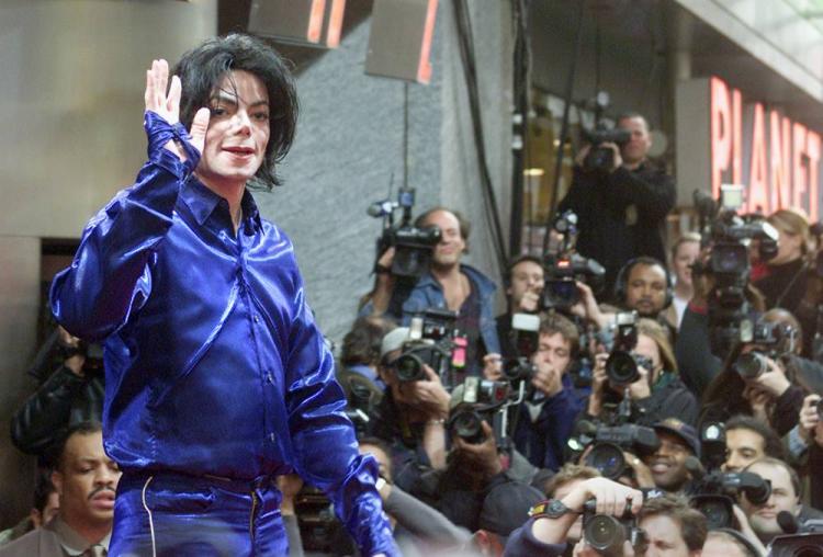 Майкл Джексон позирует перед фотографами на презентации своего альбома ?Invincible? на Таймс Сквер в Нью-Йорке в ноябре 2001 годе. Новый альбом, который вышел 30 октября того года, стал самым дорогим из когда-либо записанных альбомов и был принят критиками и фанатами лучше, чем альбом ?HIStory? 1995 года. (Brad Rickerby/Reuters/Corbis)