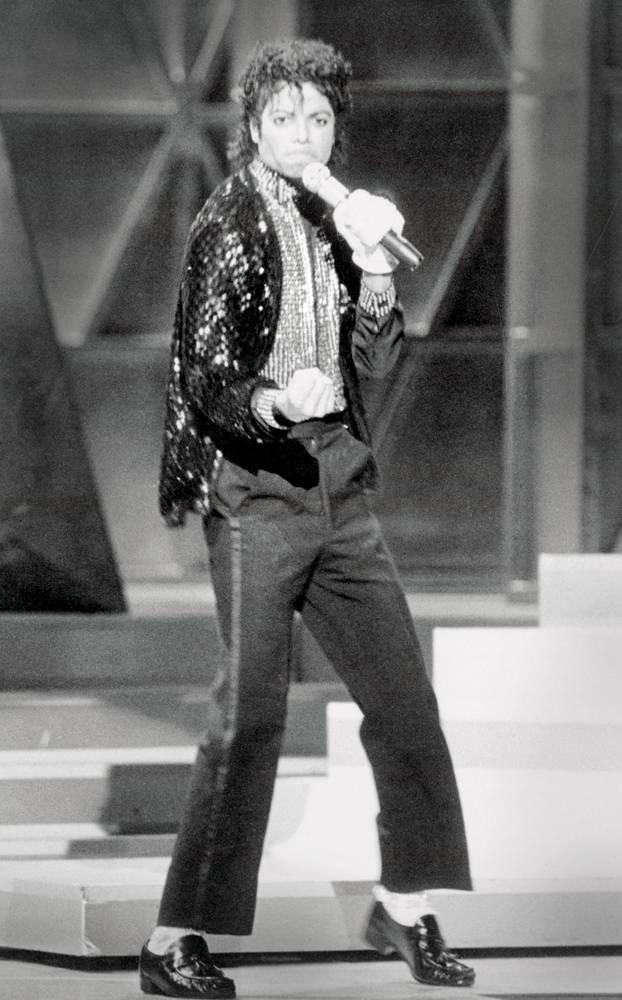 Майкл Джексон впервые показывает свою знаменитую ?лунную походку? во время исполнения песни ?Billie Jean?. Это танцевальное движение, которое впоследствии стало визитной карточкой певца, ошеломило зрителей, и Майкл был коронован титулом ?Король Поп музыки? (Bettmann/Corbis)