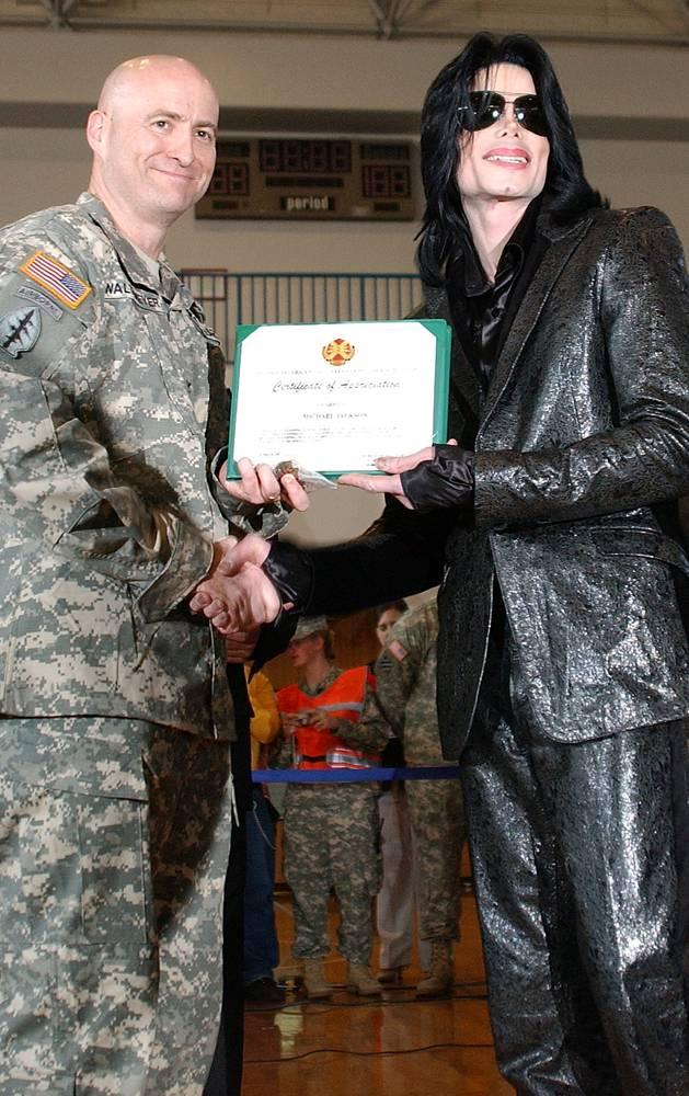 Майкл Джексон получает письменную благодарность от полковника Роберта М Валтмеера, командующего гарнизоном Зама в Японии 10 марта 2007 года. Майкл приветствовал тысячи американских военнослужащих и членов их семей. (U.S. Army via Getty Images)