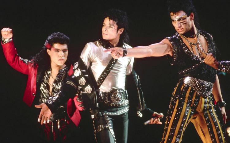 Майкл Джексон и его танцоры во время тура по раскрутке альбома ?Bad? в Токио 1987 году. Годом ранее Джексон снялся в 3-D научно-фантастическом музыкальном фильме ?Капитан Ио? (Captain EO), одном из самых дорогих и коротких фильмов. Джексон постепенно стал объектом для все возрастающей критики, поскольку его альбомы и клипы становились все более дорогими, но выходили все реже и реже. Его следующий альбом ?Dangerous? вышел только в 1991 году. (Neal Preston/Corbis)