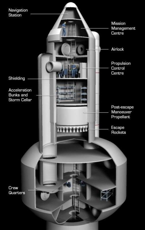 ?Орион? состоял из следующих модулей: propulsion module, propellant magazines и payload section. Эти названия можно перевести следующим образом: движитель, топливные ёмкости, отсек полезной нагрузки. Движитель состоял из тяговой плиты, амортизаторов и основной секции, содержащей порядка 900 ядерных зарядов