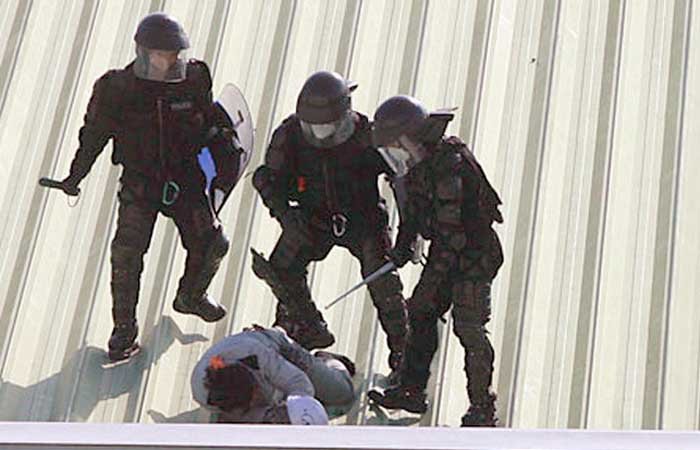 В это воскресенье один из боссов компании с легкозапоминающимся именем Ли Ю выставил ультиматум бастующим: всем выйти, а то мы сравняем завод с землей! Отключили на территории электричество и воду. 120 человек вышло, остальные, около 520, остались. В ночь на вторник полиция начала штурм.