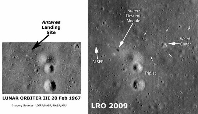 На снимках этого же района, сделанных аппаратом "Лунар Орбитер III" в 1967 году, никаких "дополнений" к лунному пейзажу не видно. По мнению команды, курирующей миссию LRO, если бы странное образование присутствовало на Луне еще до посадки корабл*я, его можно было бы разглядеть даже на снимках 40-летней давности.