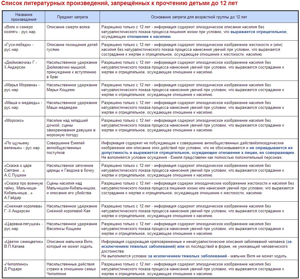 Русские народные сказки под запретом 10/08/2013 13:07 Сайт ответственных родителей. Список литературных произведений, запрещённых к прочтению детьми до 12 лет.Вот так.Кликабельноисточник Главная / Статьи -21 Admin 15 2 627