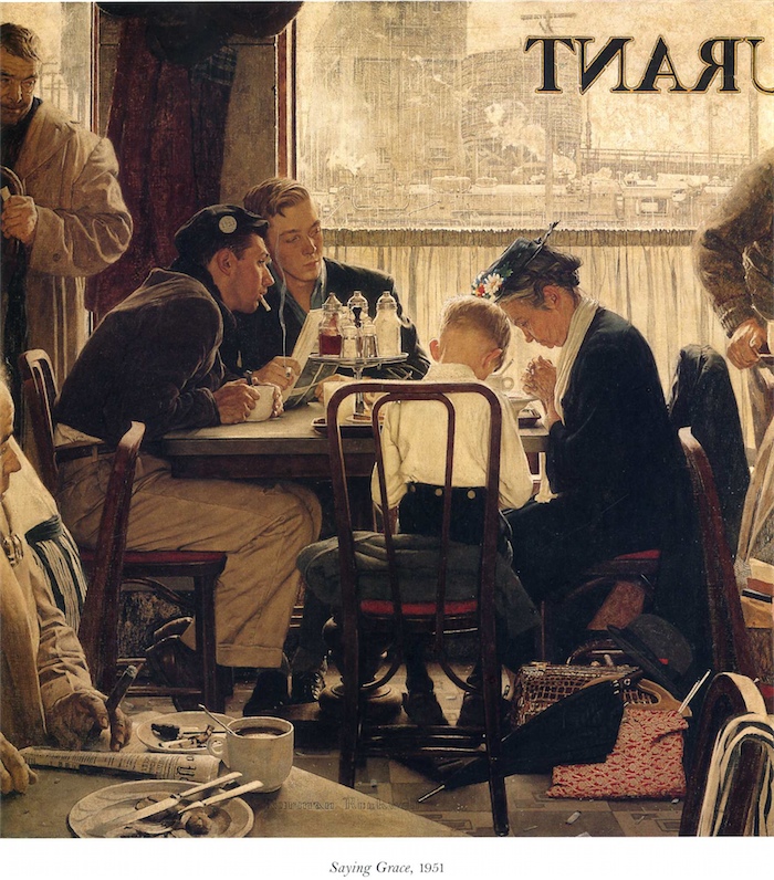 Стоимость лота составила $46,000,000. На картине гениального иллюстратора изображена пожилая женщина, которая склонила голову в молитве над едой в привокзальном кафе вместе со своим внуком. Это одни из типичных сюжетов из ежедневной американской жизни того времени, которые так любил писать мастер. Примечательно, что именно эта картина принесла Роквеллу известность и популярность, будучи опубликованной на обложке популярного в США журнала в 1951 году и став обладательницей титула "Выбор читателей" в 1955 году.