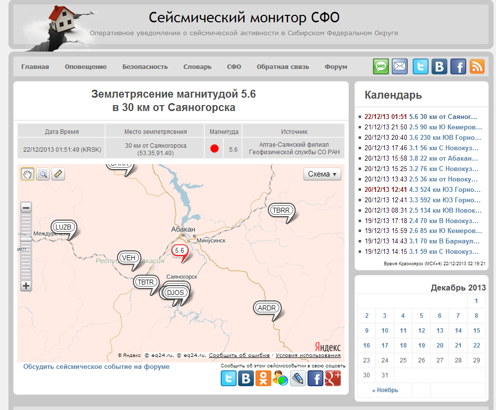 22 декабря 2013 на юго-западе Сибири в 30 км от Саяногорска произошло землетрясение магнитудой 5.0 (по данным с eq24.ru - 5.6).