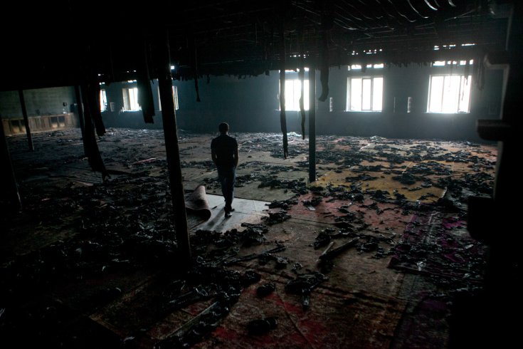 Мужчина стоит в сгоревшей мечети. За три дня до этого на мечеть во время вечерней службы сделали налёт неизвестные вооружённые лица. Был убит имам мечети и два прихожанина: