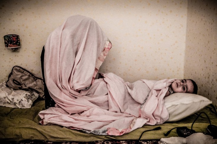 Зухра сидит в комнате своего дома. Она была ранена в ногу при проведении КТО. После этого её арестовали и допрашивали в течение двух дней: