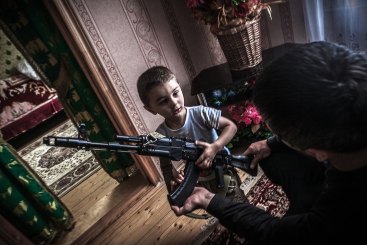 Магомед, школьный учитель, показывает своему 2-летнему племяннику, как обращаться с автоматом:
