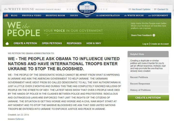 На сайте Белого дома зарегистрирована петиция с просьбой к Бараку Обаме поддержать введение в Украину войск ООН, чтобы остановить кровопролитие. Если в течение месяца петиция соберет 100 тысяч подписей, власть США ее рассмотрит.