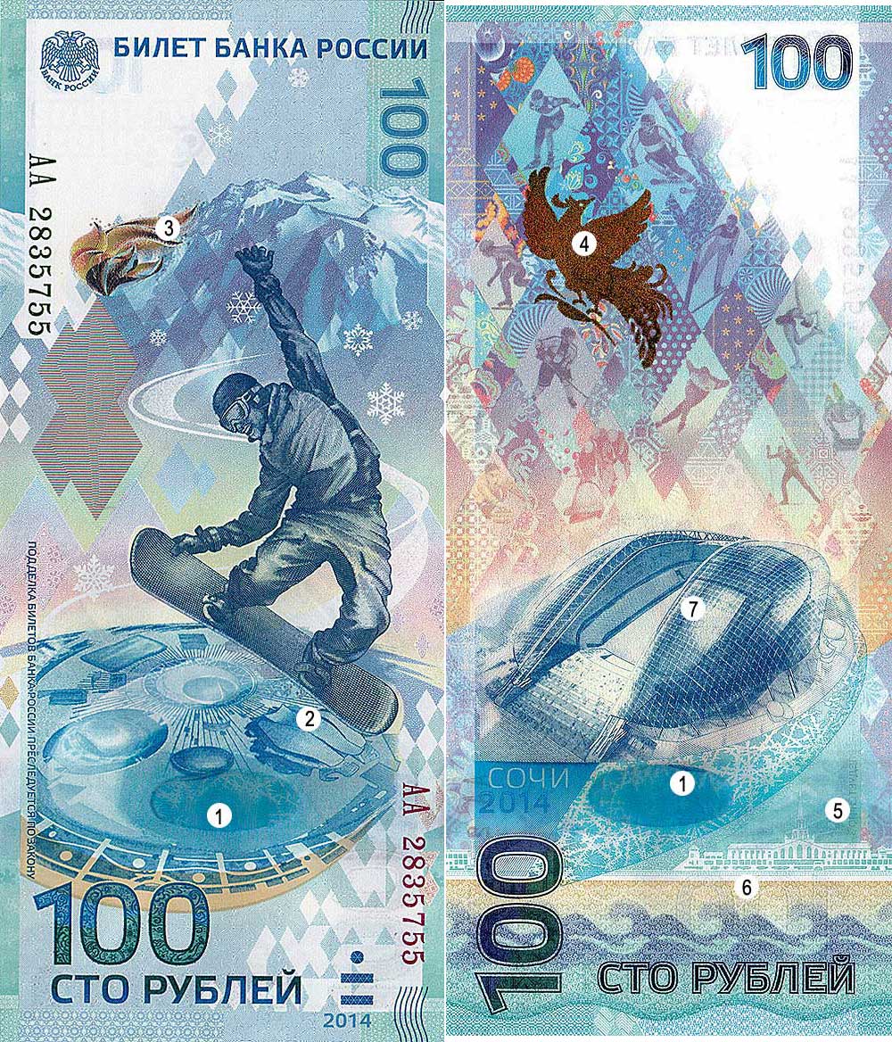 Олимпийские 100 рублей стали первыми памятными бумажными деньгами в истории зимних Игр (до этого выпускали только монеты) и первой российской вертикальной купюрой. Центробанк планирует напечатать 20 миллионов таких купюр.