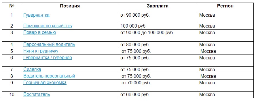 В первой тройке оказались гувернантка, помощник по хозяйству и повар в семью. За помощь с детьми, работы по уходу за домом и за приготовление еды работодатели готовы платить не менее 100 000 рублей! При этом самые жесткие критерии отбора у повара, а гувернантке нужно будет жить у работодателя, тогда как помощнику по хозяйству, кроме знаний по ремонту и строительству, требуется хорошо владеть компьютером.