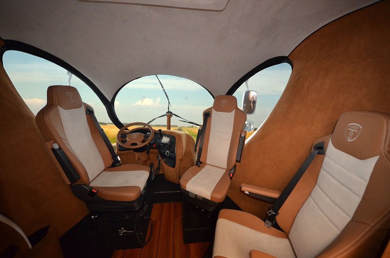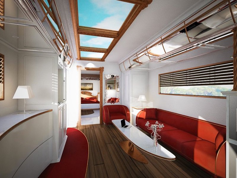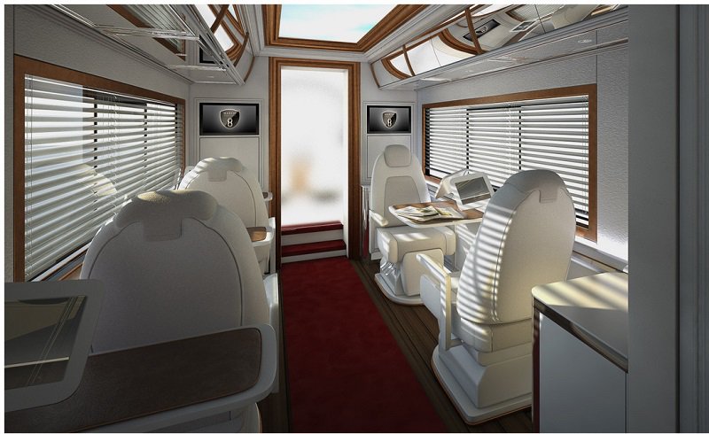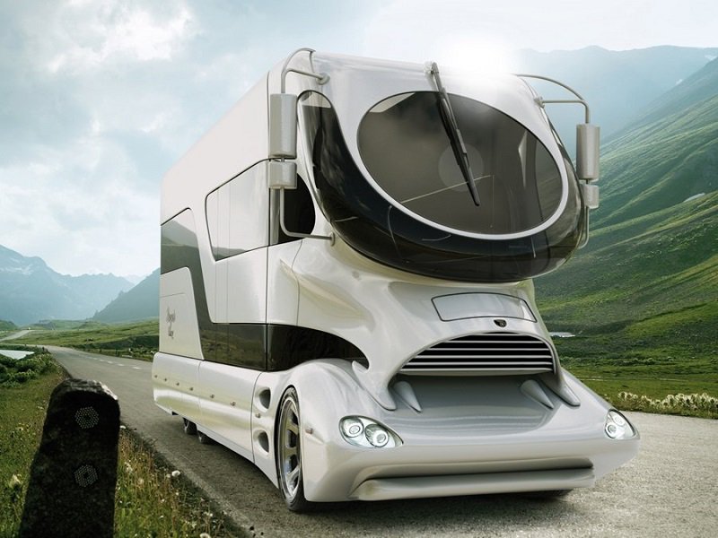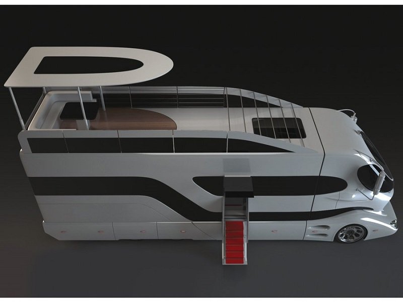 Дизайнеры, которые разрабатывали данный концепт, использовали и учли не только самые современные достижения в автомобилестроении, но также и особенности авиа-, авто- и яхтенного спорта. В особняке на колесах есть трап, как у самолета бизнес-класса, выхлопная система спортивного автомобиля и открытая площадка, как на крыше моторной яхты.