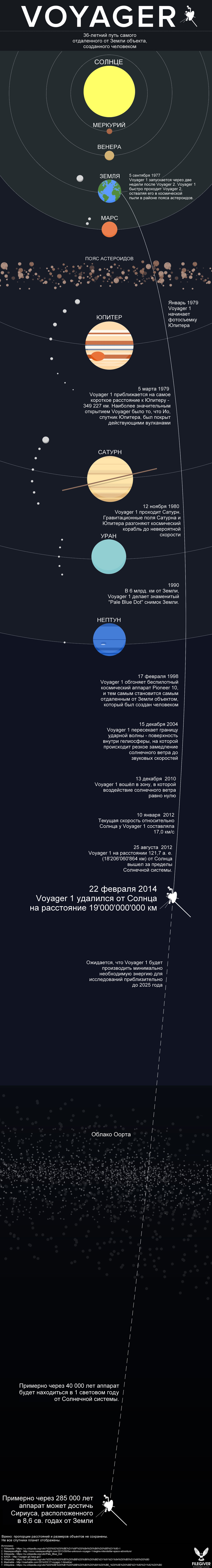 5-го сентября 1977 года автоматический зонд Voyager 1 был запущен с мыса Канаверал (Флорида, США). 22 февраля 2014 года Voyager 1 удалился от Солнца на расстояние 19 000 000 000 км. На момент публикации поста зонд находится на расстоянии 19'010'023'115 км от Земли, и 19'037'197'698 км от Солнца.