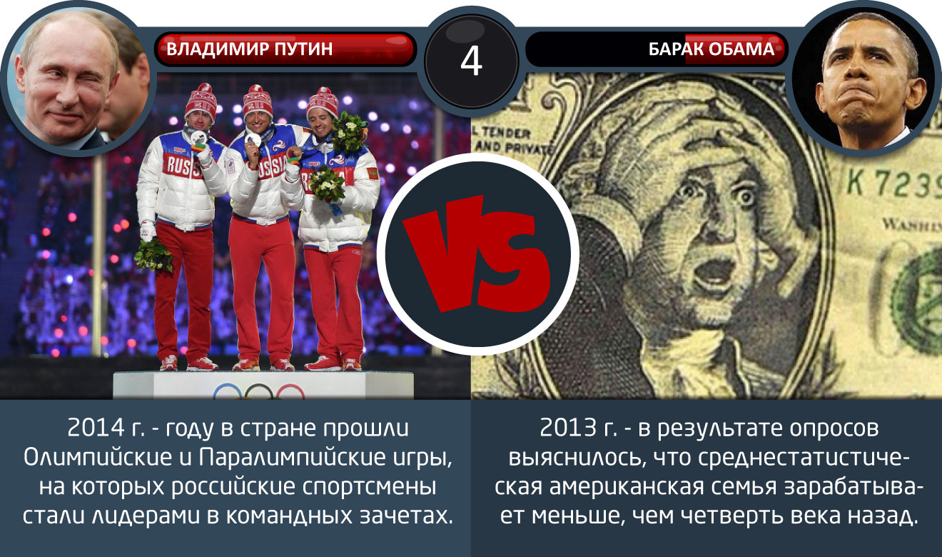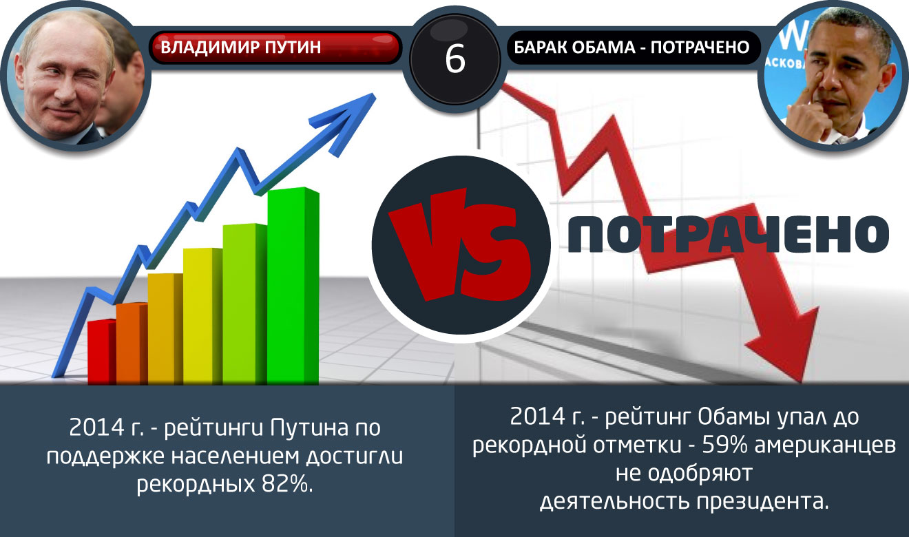 Два года Путина и срок Обамы 08/05/2014 00:07 7 мая 2012 года состоялась инаугурация Владимира Путина За это время наш президент показал себя: урегулировал в Сирии, провел победную Олимпиаду в Сочи, решил с Крымом. Сравним с Б.Обамой? Главная / Статьи +45 Admin 28 2 952