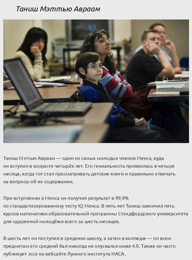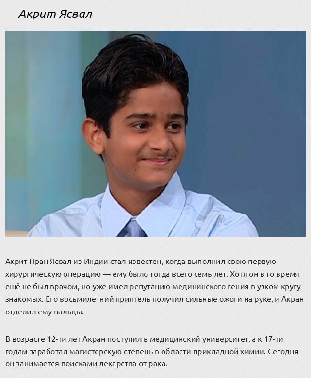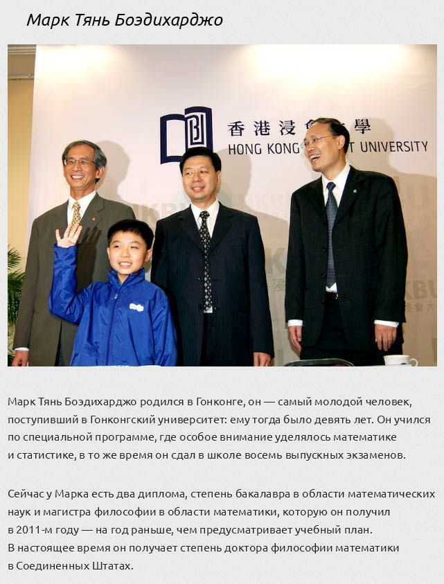 Большинство людей старается добиться лучших результатов в своей профессиональной области, затрачивая на это уйму усилий и времени, а кому-то с рождения дается талант от природы, и дети могут даже превосходить взрослых в той или иной сфере науки. Сегодня я расскажу вам о настоящих вундеркиндах, которые достигли невероятных успехов в различных профессиях и науках.