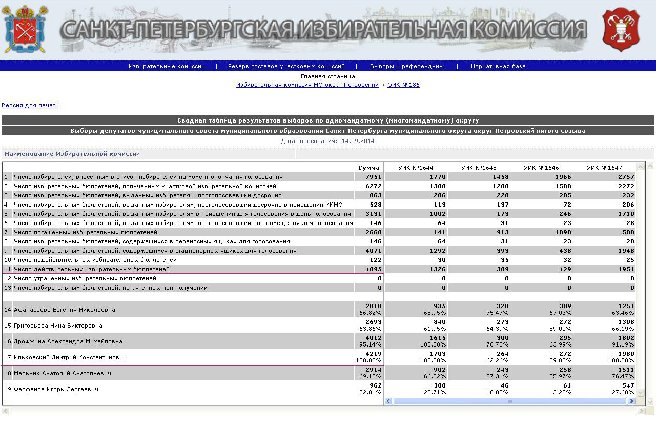 На УИК №912 в МО «Полюстрово» единоросс Андрей Жабрев получил 473 голоса (117%), в то время как всего на участке было выдано 423 бюллетеня, при этом 19 из них признаны недействительными.
