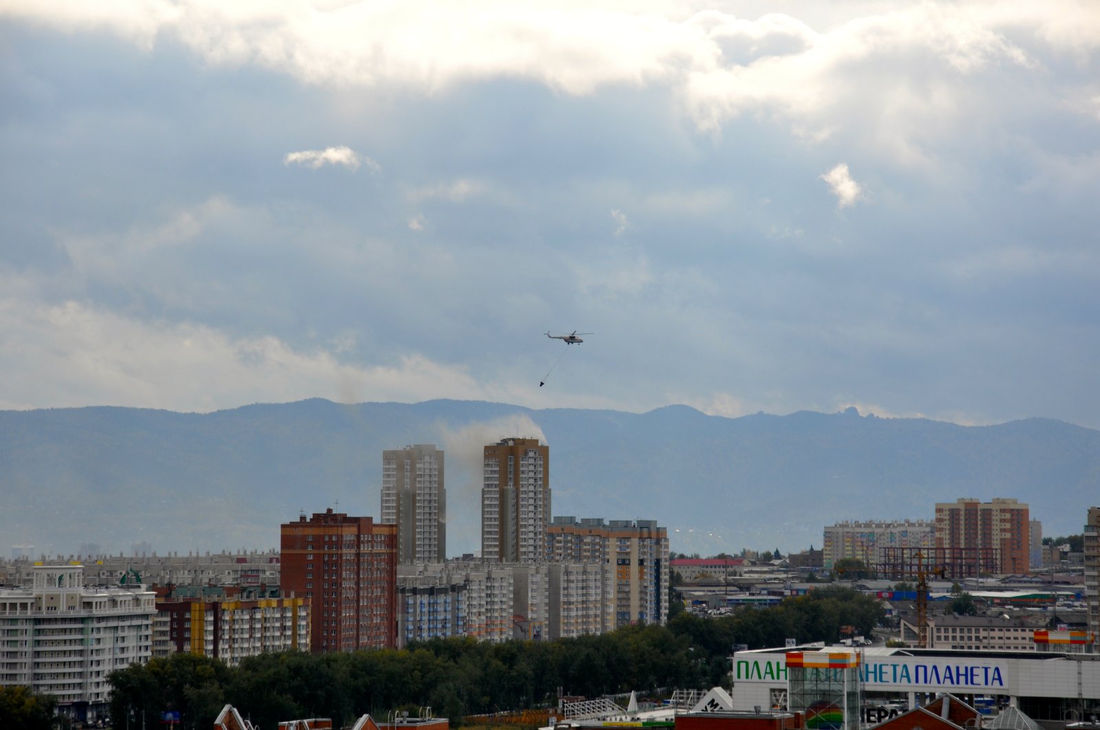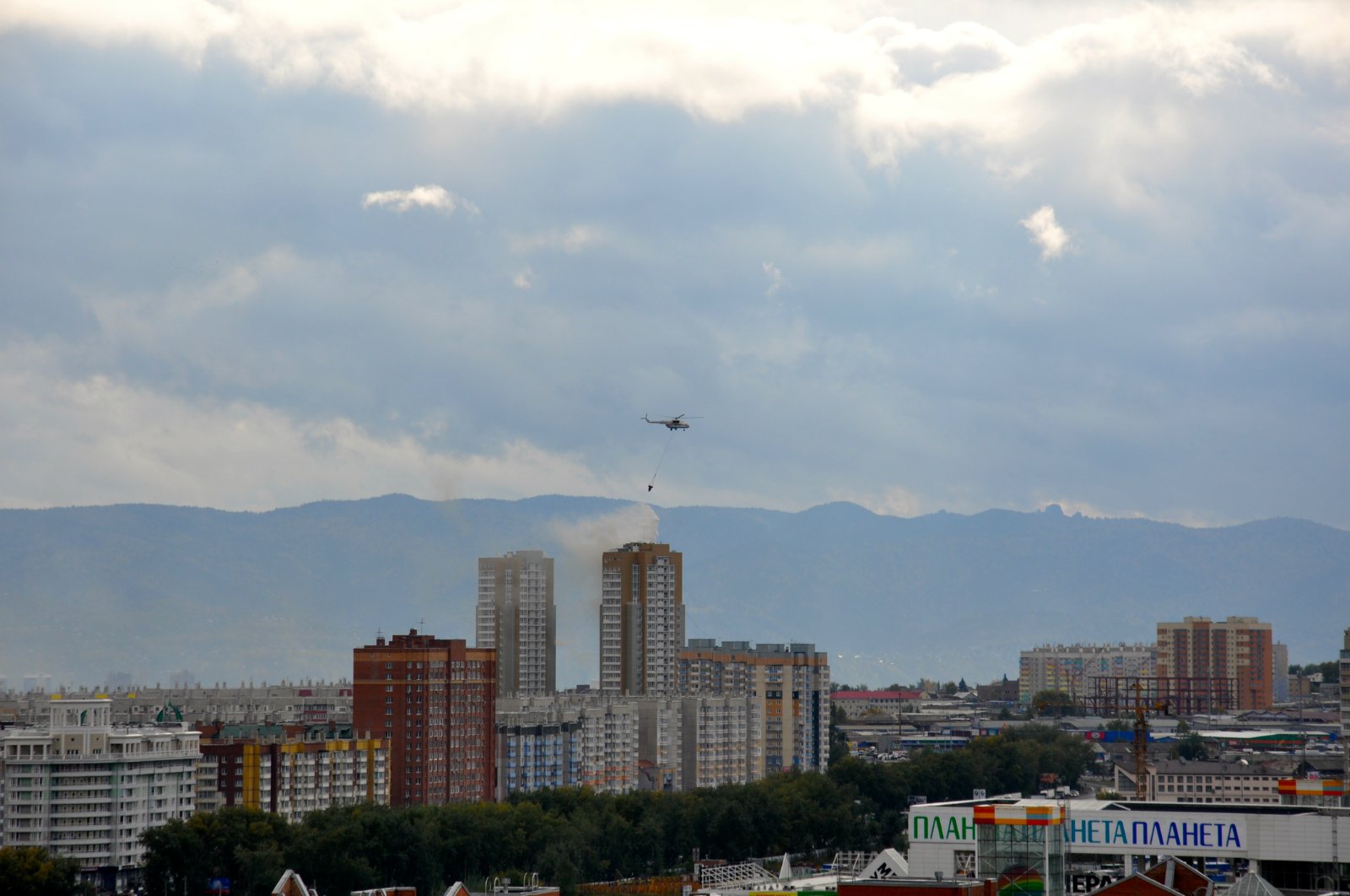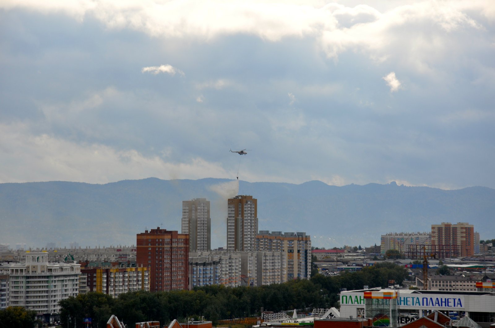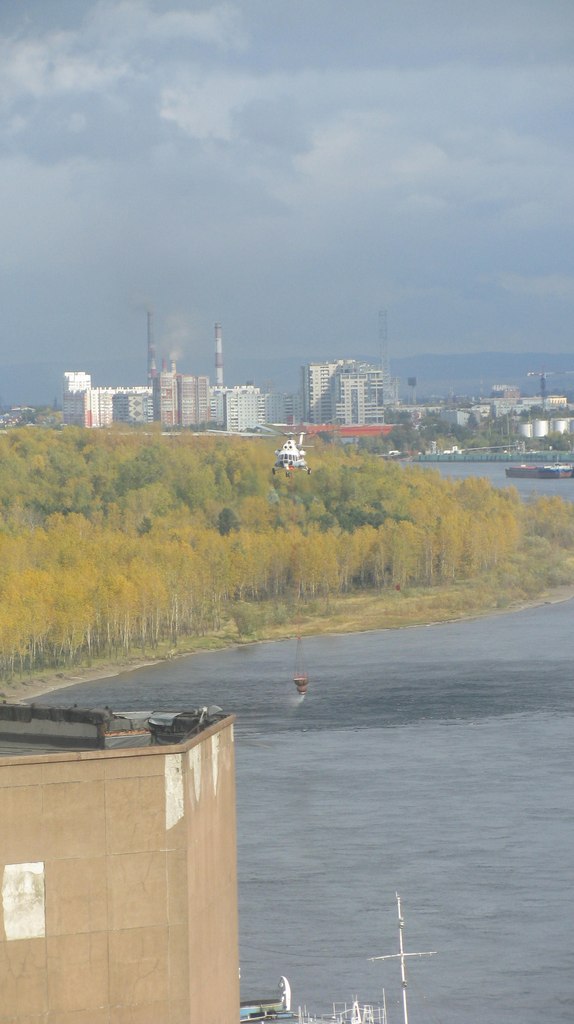 16:45 Ну почти потушили. Вертолет набирает воду в Енисее для тушения