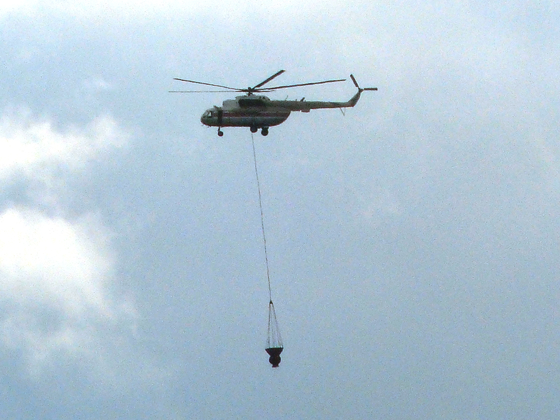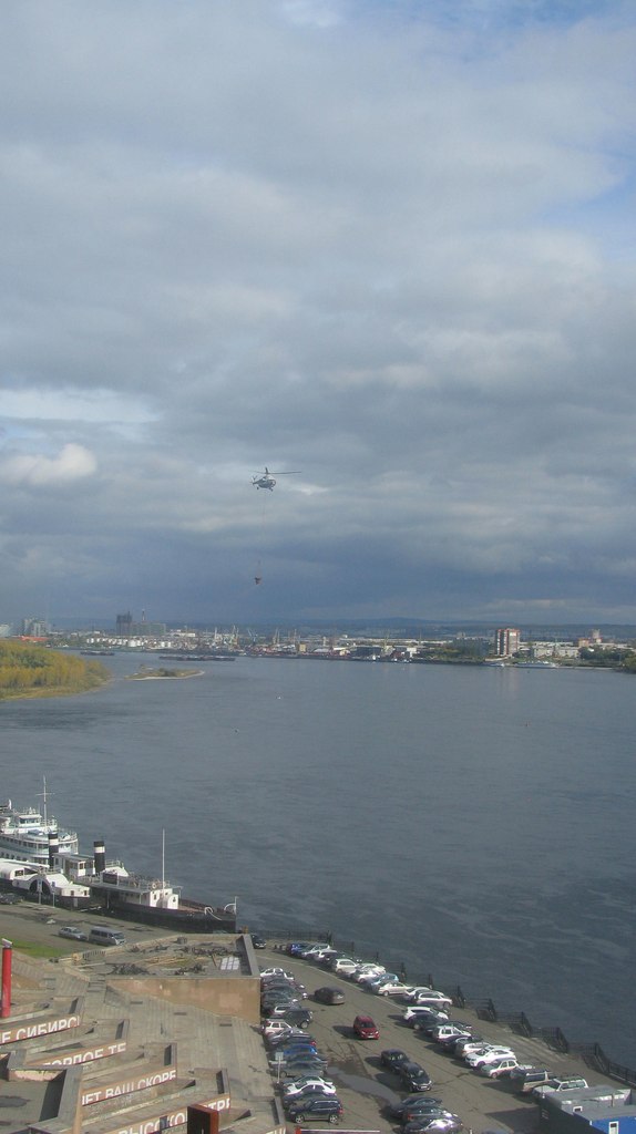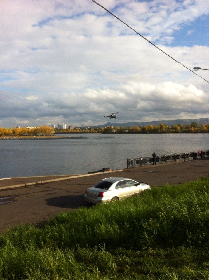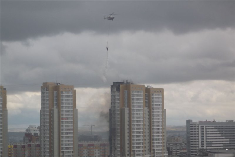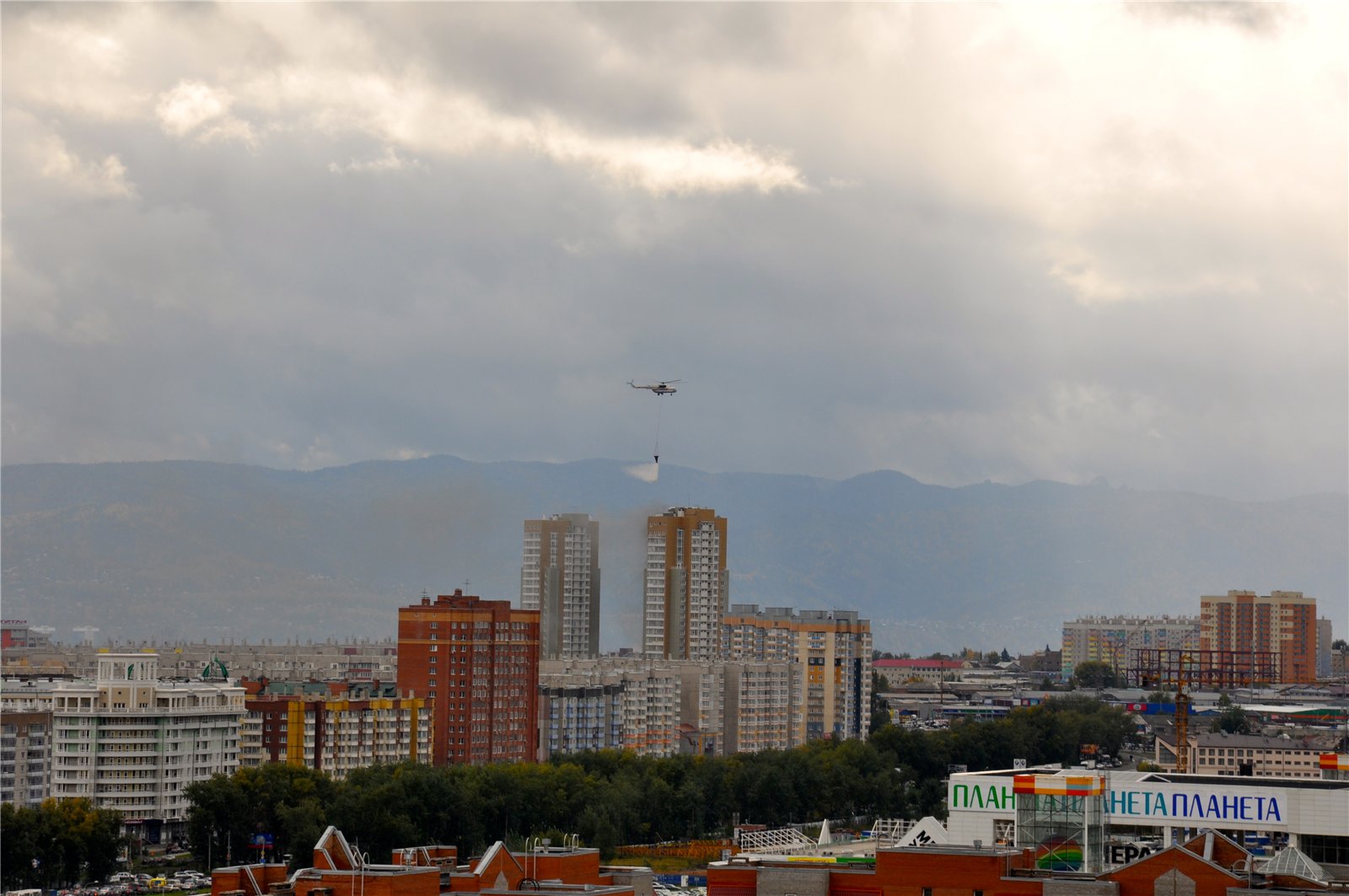 16:45 Ну почти потушили. Вертолет набирает воду в Енисее для тушения