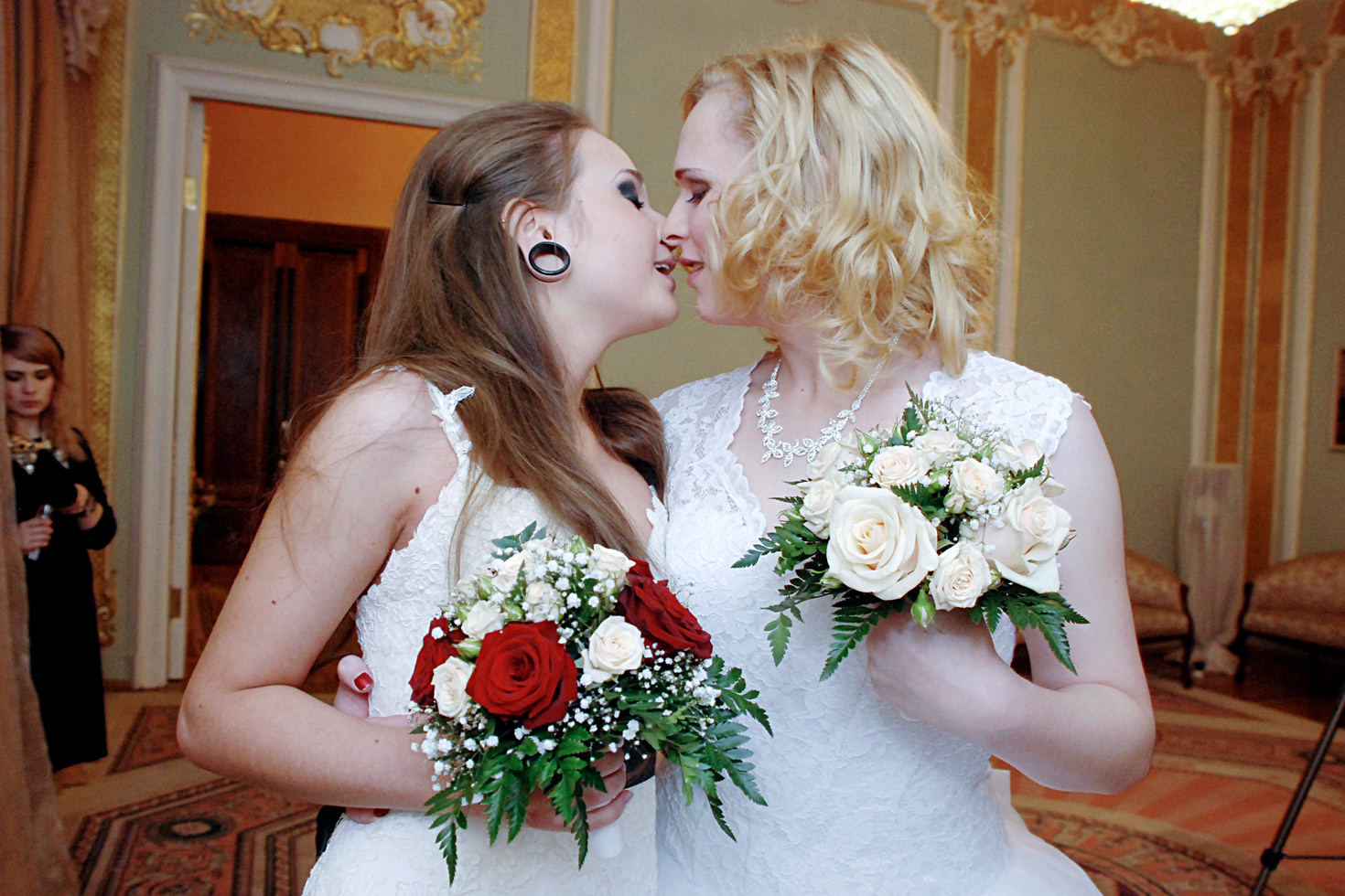 Совершенно неожиданно в Петербурге был зарегистрирован однополый брак. В ЗАГС действительно пришли две невесты в свадебных платьях, Ирина и Алёна, и их расписали, и это несмотря на строгий запрет подобных браков в России. А всё потому, что барышни нашли лазейку. Одна из них на самом деле и не барышня вовсе, а кавалер. По крайней мере Ирина по паспорту мужчина и является транссексуалом. Ирина носит женскую одежду и красится, в данный момент сидит на гормонах, поэтому выглядит практически как девушка. Но формально пока паспорт не поменяла является мужчиной. А российский закон трактует брак как "добровольный союз между мужчиной и женщиной". Бинго!