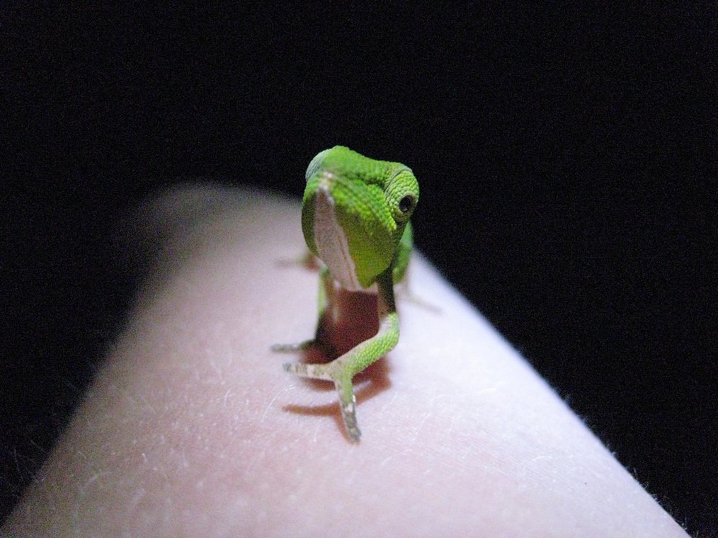 5. Их баллистические языки составляют 1.5-2 длины хамелеона. Хамелеоны питаются "стреляя" издалека своим длинным языком по добыче. Языки хамелеонов составляют 1.5-2 длины их тела (не учитывая хвоста), недавно было замечено, что языки маленьких хамелеонов составляют даже больший коэффициент. Бросок языка очень быстр - достигая добычу за 0.07 секунд с ускорением в 41G. На кончике языка хамелеона расположен небольшой шарик из мышц, который при соприкосновении с добычей создаёт небольшой присоску.
