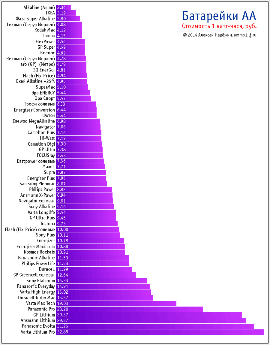 Я усреднил количество энергии, которое батарейки выдают на больших и малых токах и на основе результатов и цены батареек (которая в некоторых случаях только приблизительна) составил диаграмму стоимости одного ватт-часа для всех батареек АА.