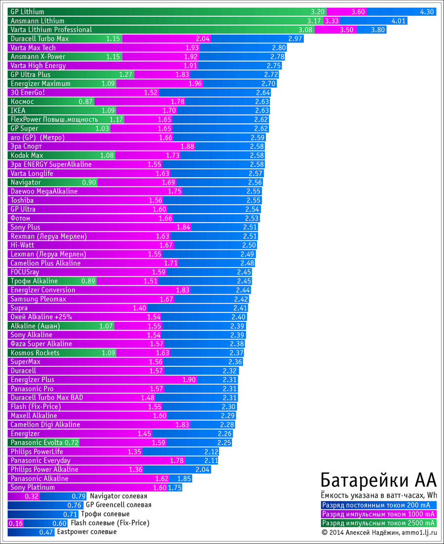• Большинство щелочных батареек отличается между собой по ёмкости всего на 15%;