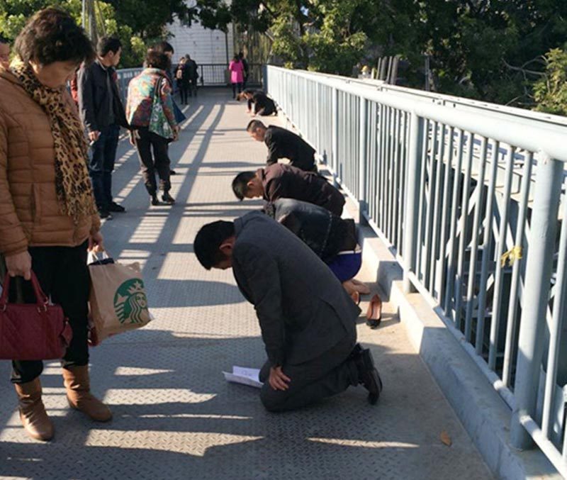 Видите эти согнутые спины на мосту? Именно так наказали менеджеров по продажам в неизвестной (пока) компании города Сямынь китайской провинции Фудзянь за недостаточное усердие в работе.