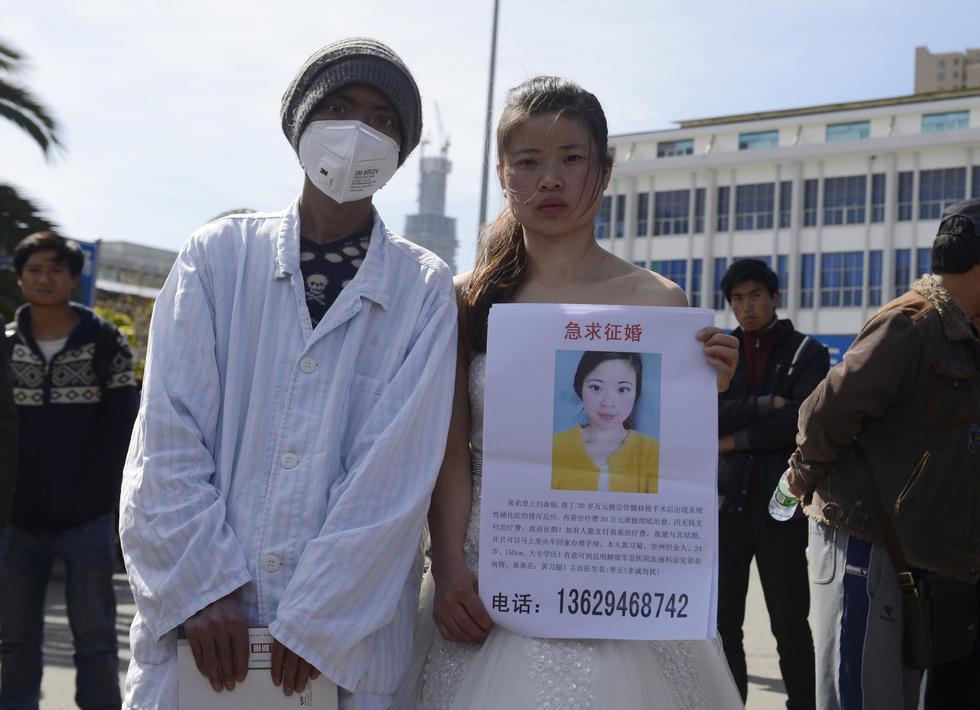 Такая вот грустная история. В Китае в одном из городов у вокзала появилась эта странная пара: молодая красивая девушка в свадебном платье и с плакатом, а рядом с ней молодой человек в больничной пижаме и с маской. Они брат и сестра. У брата лейкемия и подтверждающие этот диагноз документы из больницы. У сестры плакат, где она пишет, что выйдет замуж за того, кто оплатит счета по лечению брата. Всего нужно 300 тысяч юаней (48 тысяч долларов). Родителей у них уже нет, мать умерла месяц назад. Рассчитывать приходится только на свои силы, а нужную сумму найти просто негде.
