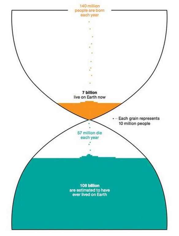 Интересная инфографика! Она показывает песочные часы, в которые сверху добавляются песчинки (1 песчинка = 10 миллионов человек). Ежегодно на планете рождается примерно 140 миллионов человек. Примерно 57 миллионов человек в год умирают.