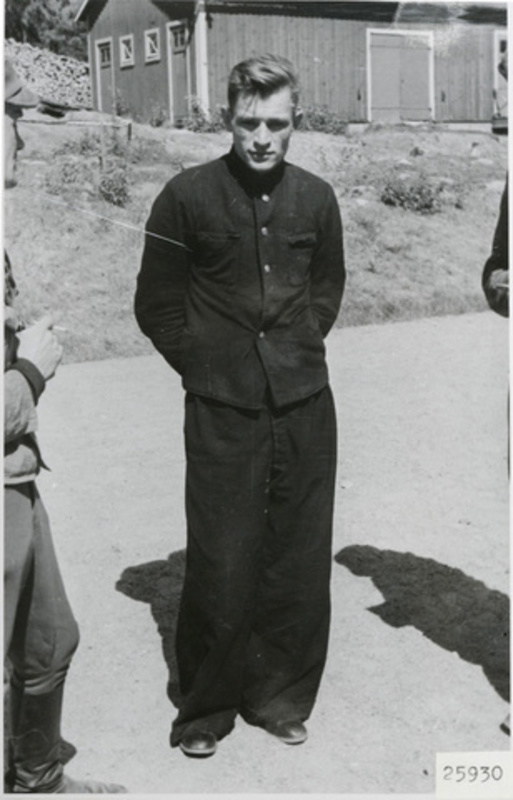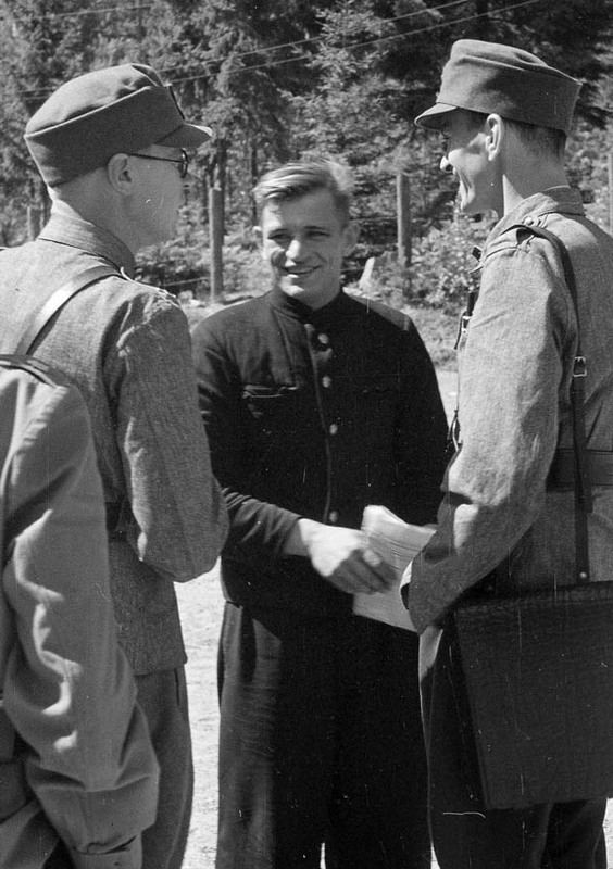 Подпись под фото: Suomalaiset upseerit keskustelivat venäläisdesantin kanssa Hangon lohkolla 17.7. 1941. Desantti nauroi viimeiselle toivomukselleen. Hänet teloitettiin kuvan ottamisen jälkeen.