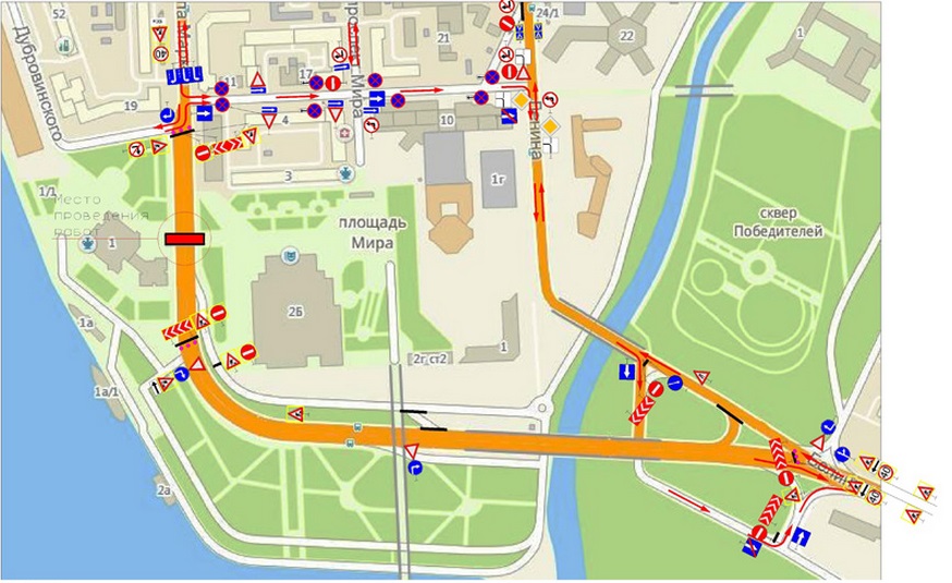 Кроме этого, если раньше главной дорогой была ул. Ленина, то теперь на период производства работ главной дорогой по отношению к ул. Ленина будет являться ул. Каратанова. При существующей схеме также изменится схема организация дорожного движения на ул. Белинского со стороны Медуниверситета в сторону центра города, а именно: предполагается закрыть ул. К. Маркса в сторону ул. Дубровинского. В связи с чем весь транспорт со стороны Медуниверситета будет уходить на ул. Ленина.