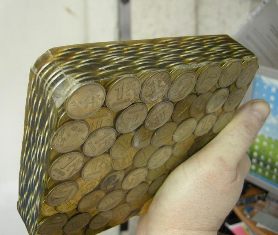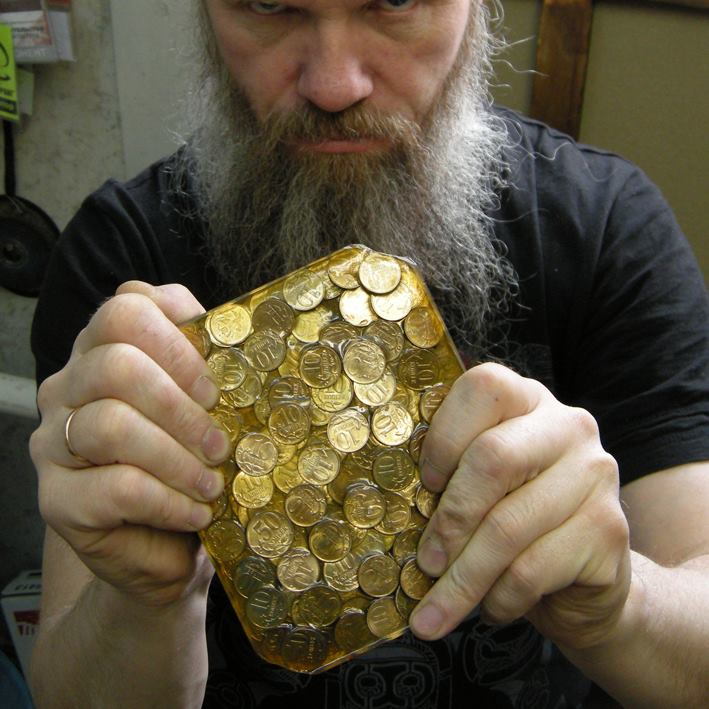 Известный красноярский художник-авангардист Василий Слонов выложил в Сеть фотографии козинака, состоящего из медных и стальных монет, залитых карамелью.