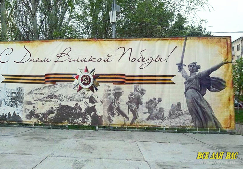 Волна не вполне корректных праздничных плакатов, поздравляющих ветеранов с Днем Победы изображениями немецких и американских солдат и боевой техники докатилась и до Волгограда. Сегодня в самом центре города, на центральной набережной, на площадке у фонтана "Искусство" был обнаружен баннер, натянутый у сцены, содержащий изображение бойцов вермахта, волею дизайнера направляющихся прямо на монумент "Родина-мать зовет". Изображение немецких солдат вполне типично, их обмундирование и вооружение трудно спутать с обмундированием и вооружением бойца Красной армии.
