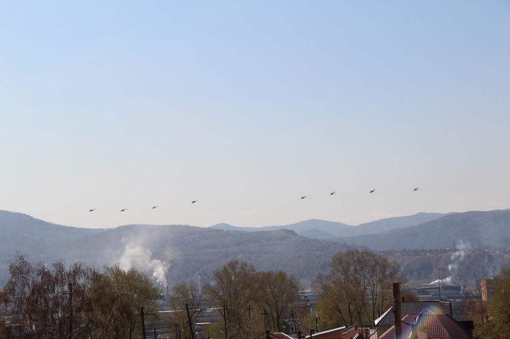Как сообщают «РИА Новости» со ссылкой на помощника командующего войсками ЦВО Ярослава Рощупкина, над Красноярском будут летать четыре транспортно-боевых вертолета Ми-8АМТШ «Терминатор», четыре ударных Ми-24 и два истребителя-перехватчика МиГ-31 БМ. По плану самолеты должны двигаться в полетном порядке на скорости 550 км/ч на высоте 350 — 400 м, вертолеты — со скоростью 200 км/ч на высоте 150 м. Репетиции воздушных парадов в честь 70-летия Победы днем 5 мая также состоятся в Новосибирске и Самаре.