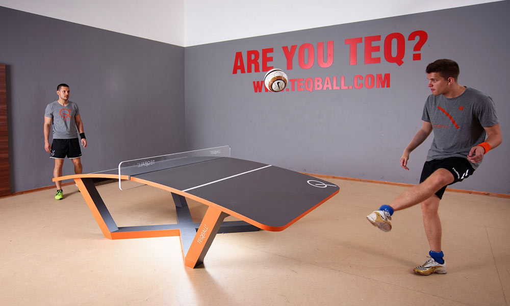 Тут какие-то люди с гордостью представили новую игру под названием Текбол (Teqball). Пишут, что это гибрид футбола и настольного тенниса. Вообще играется по правилам настольного тенниса, только вместо шарика – мяч, а использовать надо не ракетки, а ноги. В остальном правила такие же, разве что стол имеет специальный изгиб.