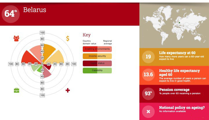 Замыкает список Афганистан. Основные проблемы: короткая продолжительность жизни (60-летний человек в среднем может прожить еще 19 лет), большой процент стариков на грани нищеты (18.4%).