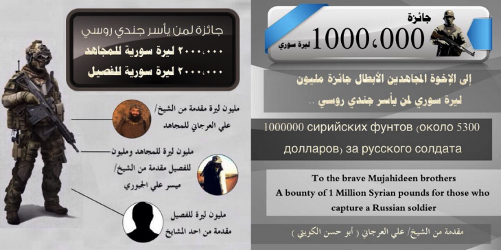 "Героические братья-моджахеды, вознаграждение за каждого русского пленного — миллион", — говорится в объявлении, авторство которого приписывают лидеру Nusra Front Абу Хассану аль-Куваити.