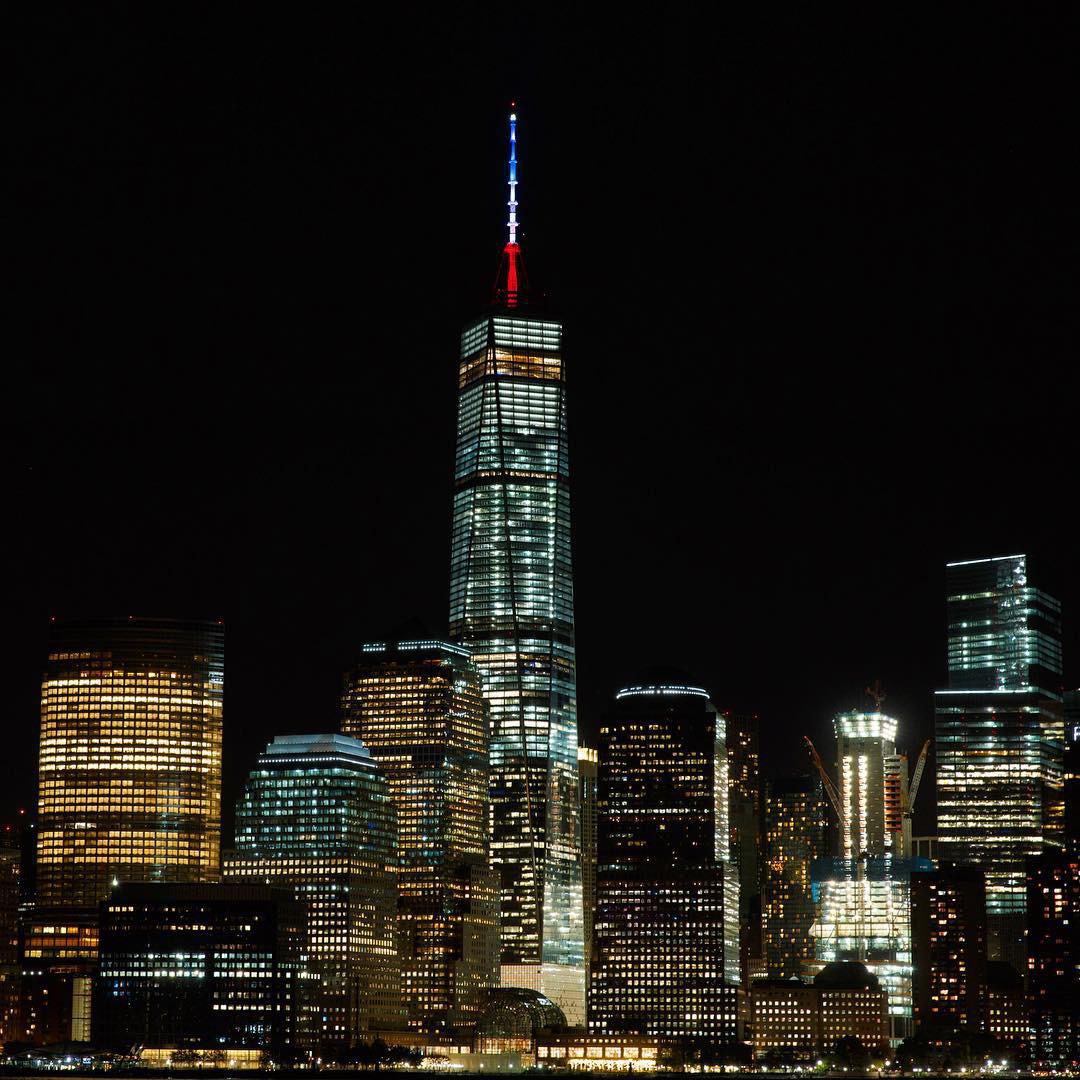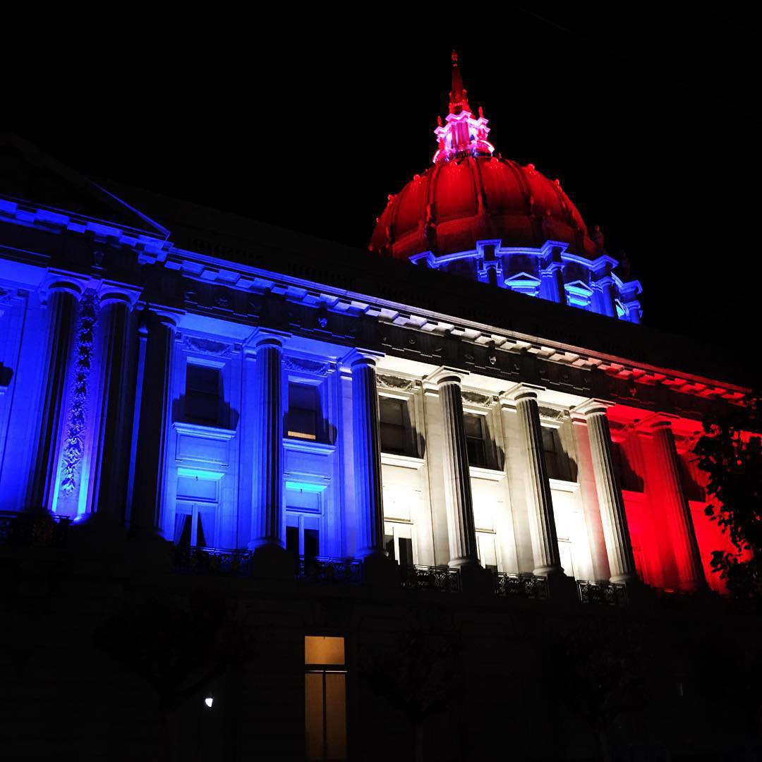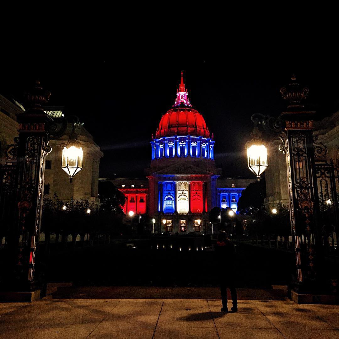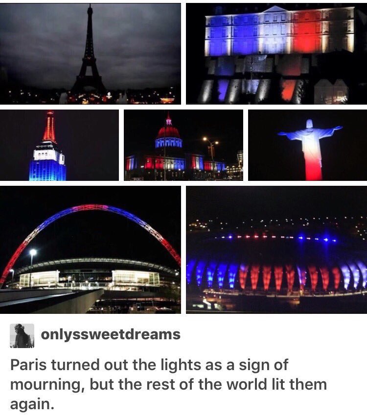 Некоторые всемирно известные здания сменили подсветку на цвета французского флага в знак солидарности.