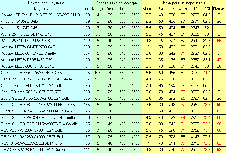 Протестировано пять ламп. Все они попали в "плохие": у четырёх пульсация света 63-90%, а вот с пятой лампой Supra SL-LED-A55-5.5W/2700/E27 Bulb всё довольно необычно. У неё невысокая пульсация света 25%, хороший CRI 82.7, но визуально свет лампы неприятный с зеленоватым оттенком. Световой поток всего 65% от заявленного и реальный эквивалент 35 Вт вместо 55 Вт обещанного. Не уверен, что у этого производителя есть хорошие лампы.
